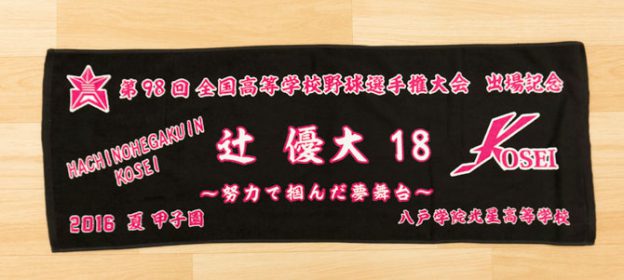 甲子園出場記念タオルです。デザインイメージ図案をご入稿いただき、こちらでレイアウトさせていただきました。黒ベタにはショッキングピンクの文字が映えインパクトもあり良い仕上がりになりました。
