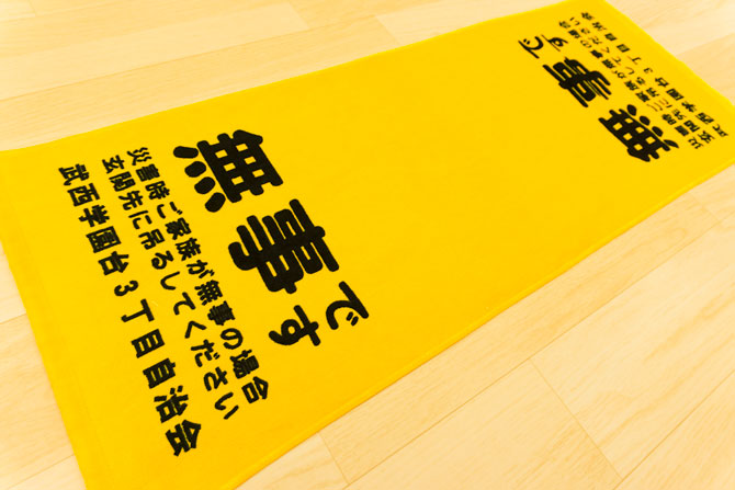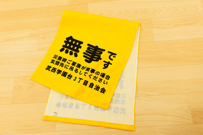 もしも災害があった時に家屋の目立つ場所にこのタオルをつるしていただくタオルです。