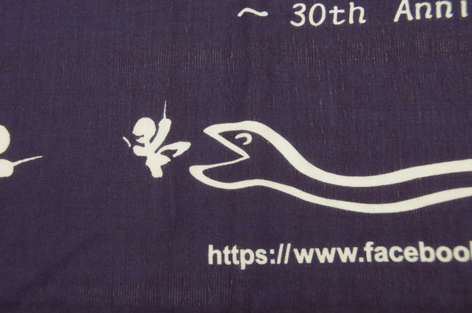 松原上まむし太鼓様記念ガーゼタオルです。30周年記念品として作らせていただきました。表面ガーゼ素材、裏面パイル(ループ)素材のタオルに紺ベタプリント白抜き柄です。