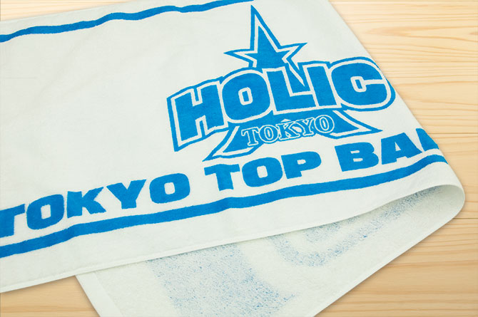 イラストレーターの完全データで入稿いただき、オリジナルスポーツタオルを製作させていただきました。※写真は水色を表現するためと質感を残すため素材が黄色っぽく写っていますが、実際は純白素材です。