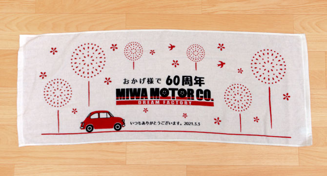 福知山市三和町 三和モーター商会様 60周年タオル 販促用 粗品 地元から愛され続ける車屋さん三和モーター商会様よりご依頼いただきました。 デザインお任せとのことで製作させていただきました。 使いやすさも重視してプリント面の少… → 続きを読む